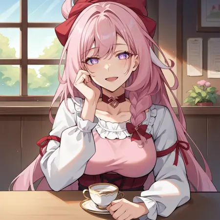 Elys, Fol003, Ely_Spr, long hair, pink hair, pointy ears, purple eyes, hair ring, braid, red ribbon, alternative ribbon, alt hair bow, red choker, pink dress, layered dress, layered skirt, cross-laced corset, red corset, alt frills, multicolored skirt, alternate frilled skirt, pink ribbon, puffy long sleeves, elysia (honkai impact),