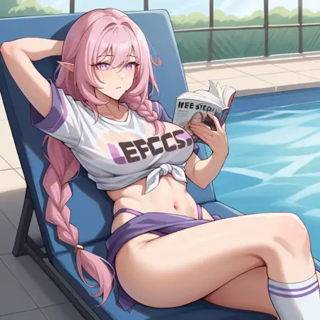 Elys, Fol002, Ely_Efc, braided ponytail, long hair, pink hair, pointy ears, purple eyes, tied shirt, bikini bottom only, white sarong, two-tone shirt, t-shirt, clothing writing, purple sleeves, alternate short sleeves, alt bracelet, white hair, streaked hair, elysia (honkai impact),