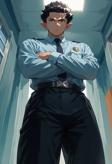 自信があり、眼鏡が大好きで、法律を犯す者には怒りで支配するが、普段は冷静で控えめな人物を生成してください。