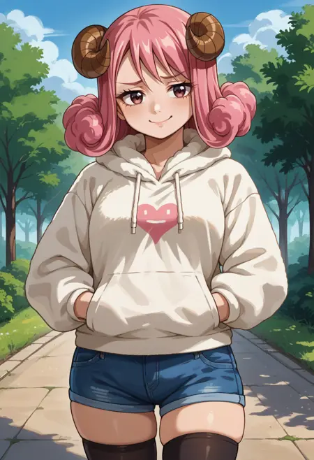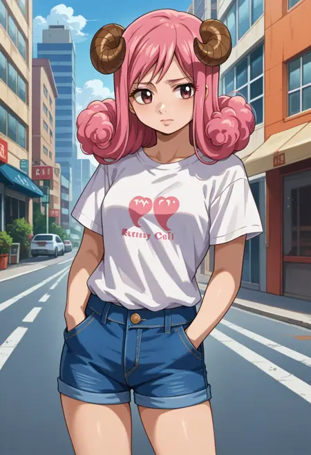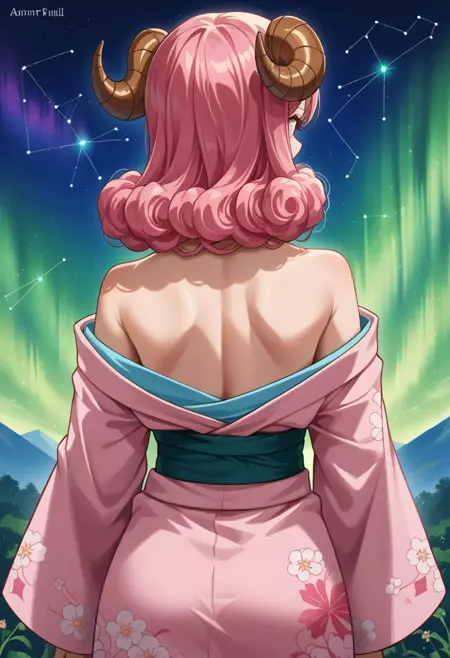 AriesFairyTail, pink eyes, curled horns, medium hair, curly hair
