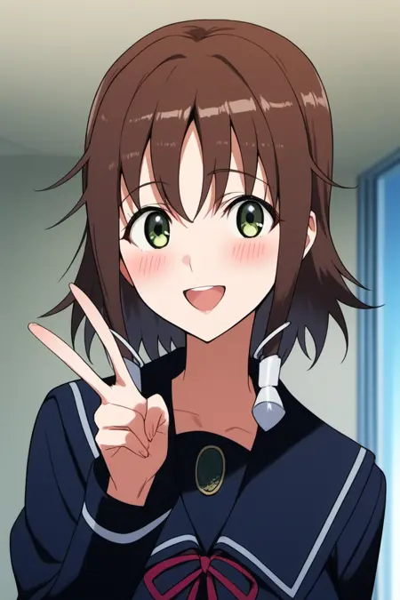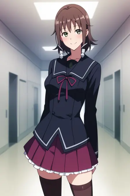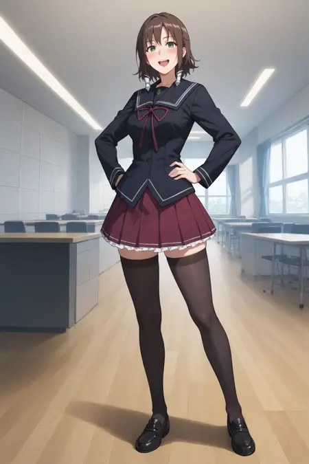 yukizome kukuri、緑の目、茶色の髪、ショートヘア、制服、黒い制服、セーラー服、紫のプリーツスカート、黒のタイツ、絶対領域、ローファー