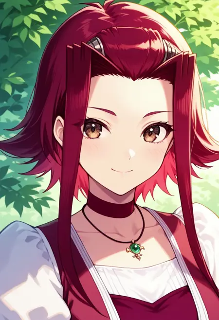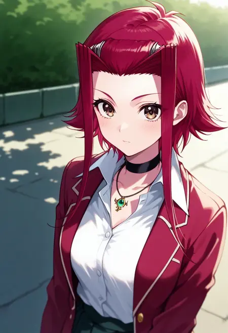 akiza, 1girl, solo, 棕色眼睛, 红发, 短发加长发绺, 珠宝, 项圈, 项链, 校服, 衬衫, 白色衬衫, 夹克, 红色夹克, 开襟夹克, 开放式服装, 裙子, 黑色裙子,