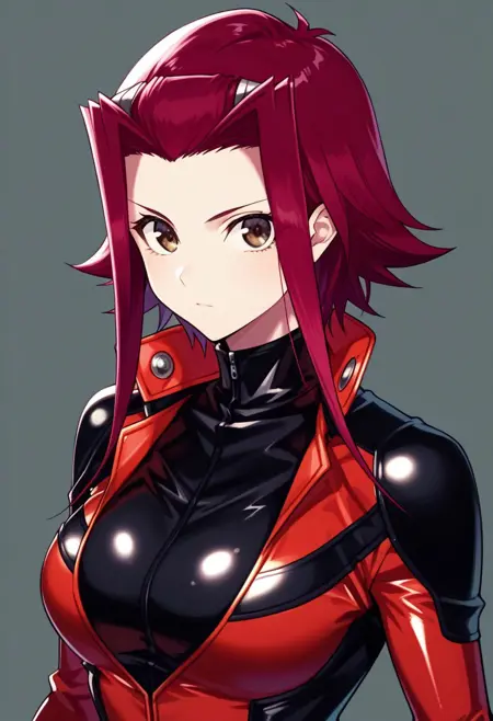 akiza, 1girl, solo, 棕色眼睛, 红发, 短发加长发绺, 机车服, 连体服, 红色连体服,