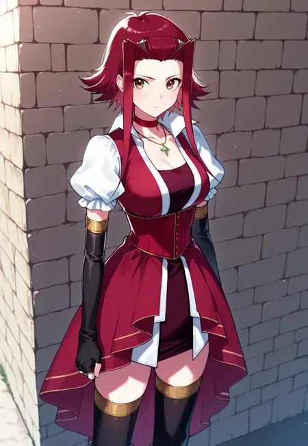 akiza, 1girl, solo, 棕色眼睛, 红发, 短发加长发绺, 珠宝, 项圈, 项链, 衬衫, 白色衬衫, 蓬松袖子, 连衣裙, 红色连衣裙, 肘部手套, 黑色手套, 露指手套, 绝对领域, 黑色过膝袜, 鞋子, 红色鞋履
