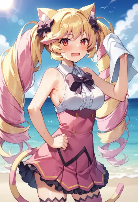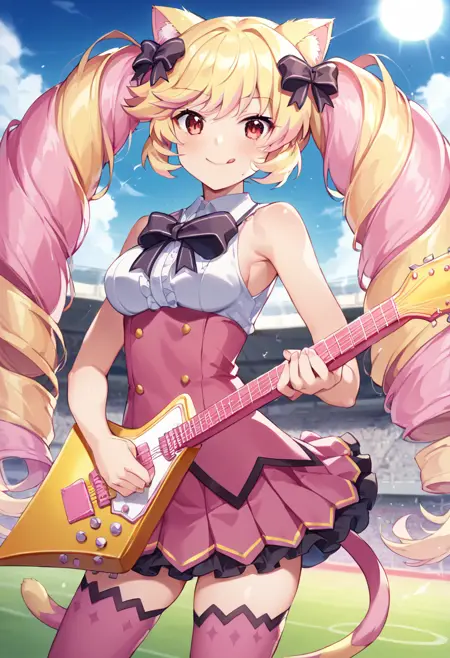 빨간 눈, 동물 귀, 매우 긴 머리카락, 이색 머리카락, 금발, 분홍색 머리카락, 드릴 헤어, 트윈테일, 머리핀, 꼬리