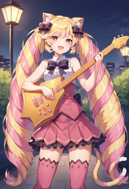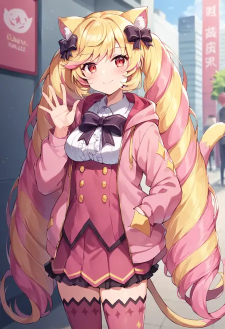 red eyes,animal ears,very long hair,two-tone hair,blonde hair,pink hair,drill hair,twintails,hair bow,tail,