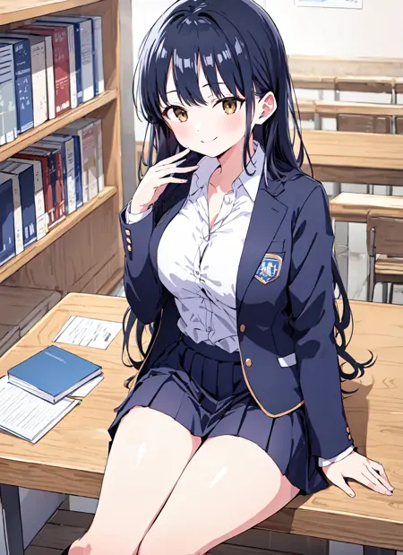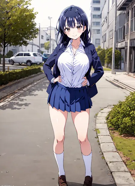 To summon Anna Yamada (School Outfit): Yamada Anna, 1girl, long hair, black hair, long sleeves, brown eyes, school uniform, jacket, white shirt, pleated skirt, collared shirt, blue skirt, blazer, cardigan, blue jacket,