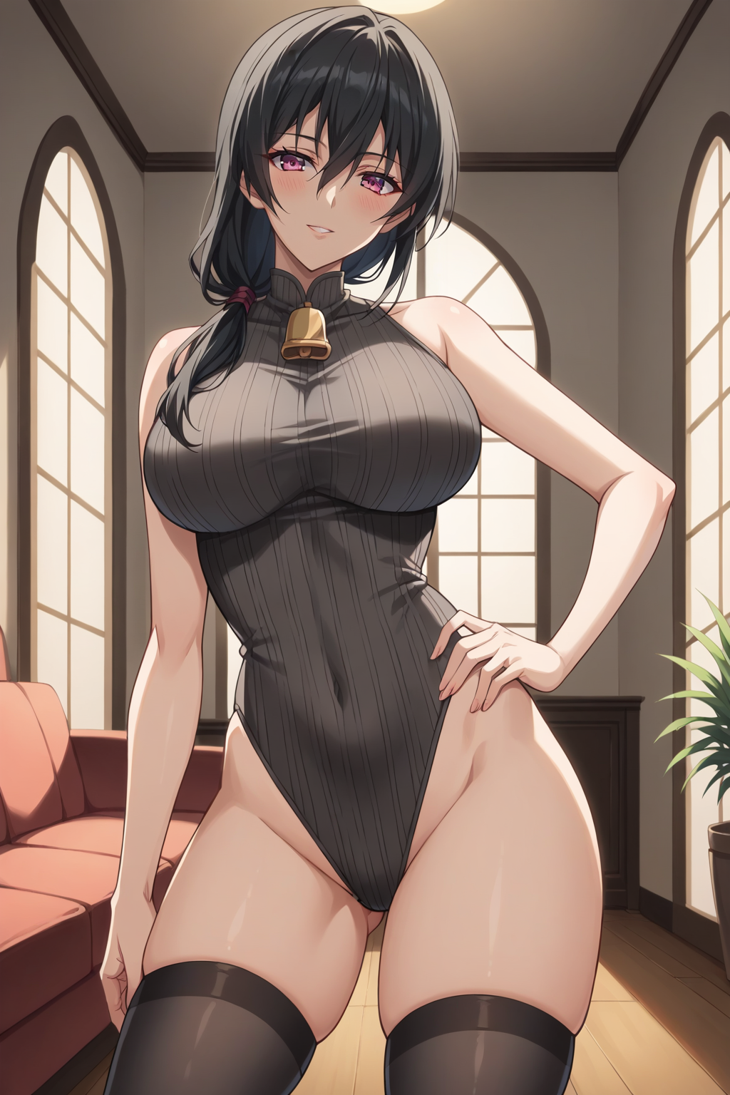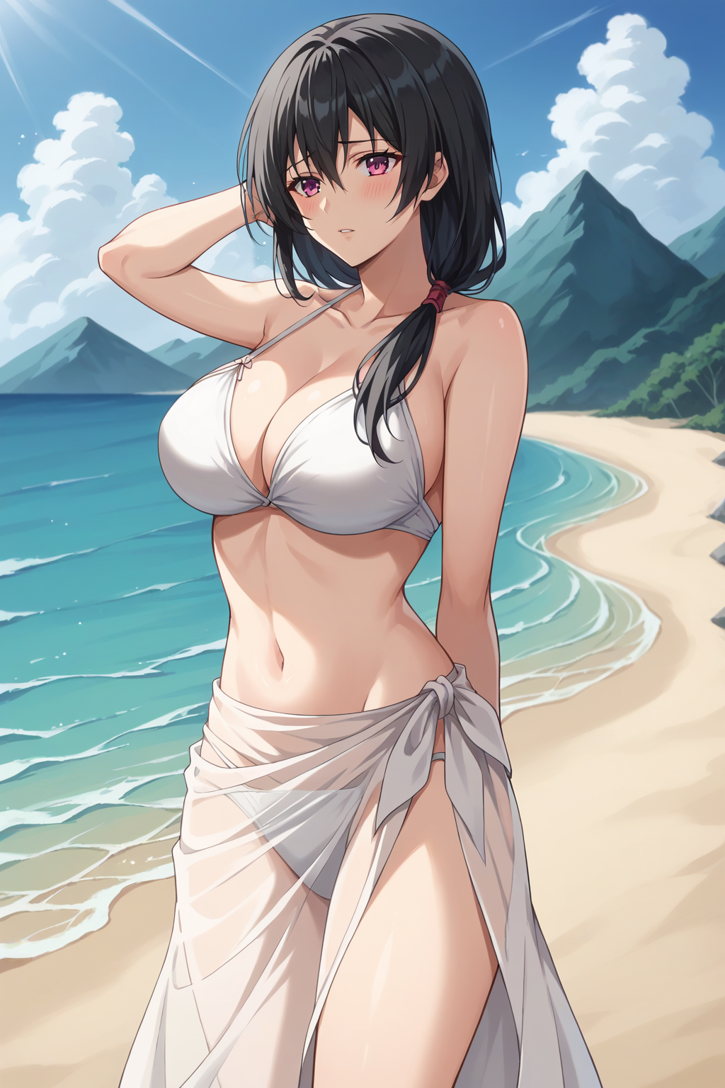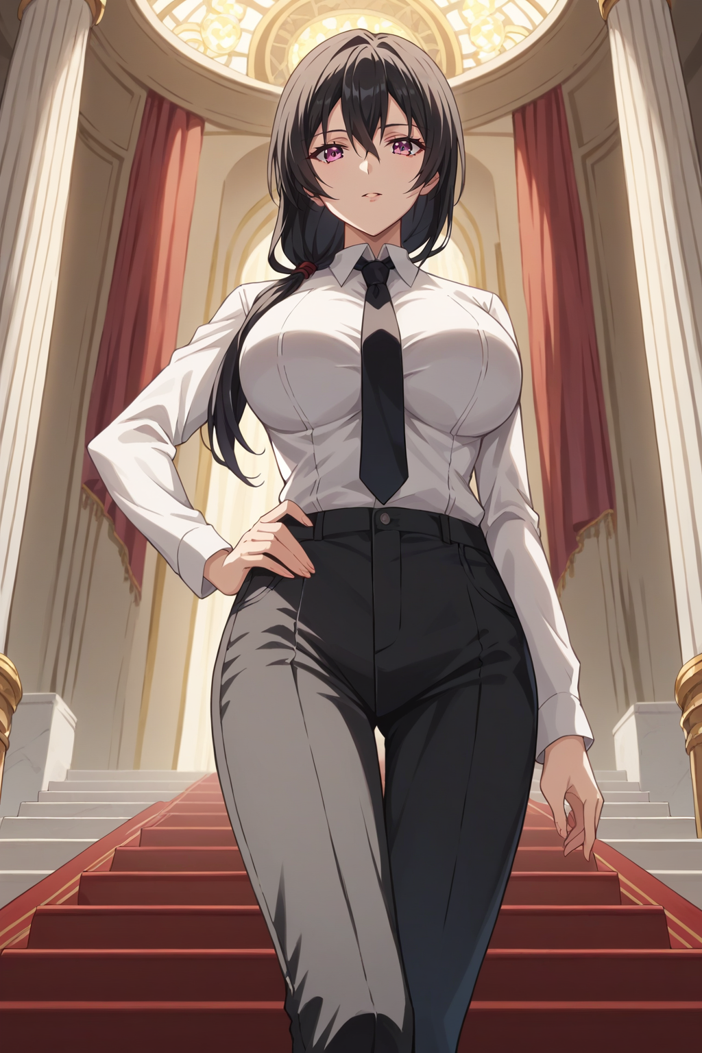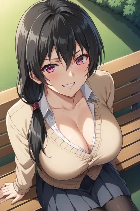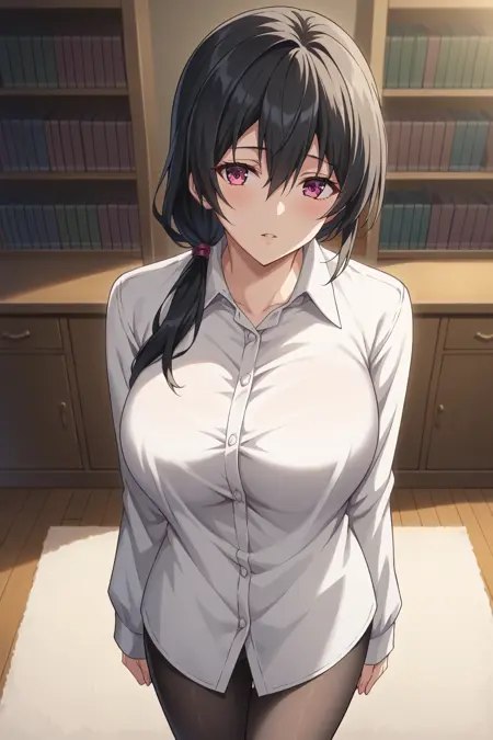 トリガー: KJOkaori, 黒髪, 濃いピンクの目, 低いポニーテール, 肩にかかる髪, 目の間の髪