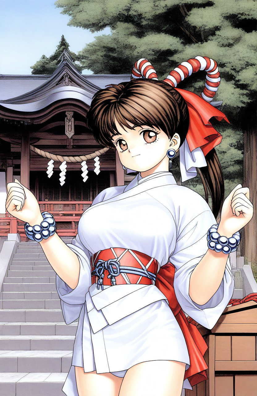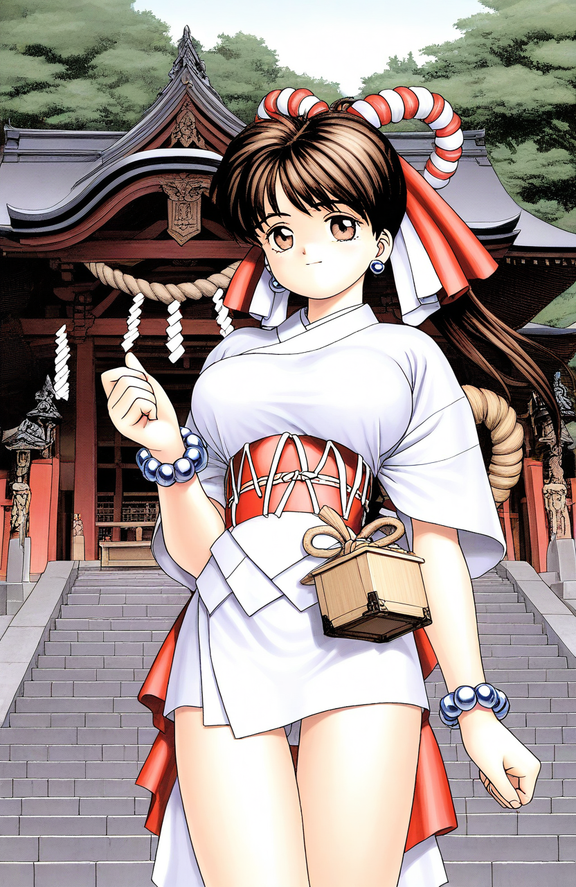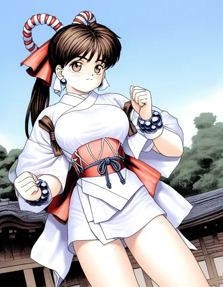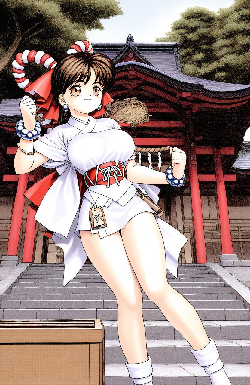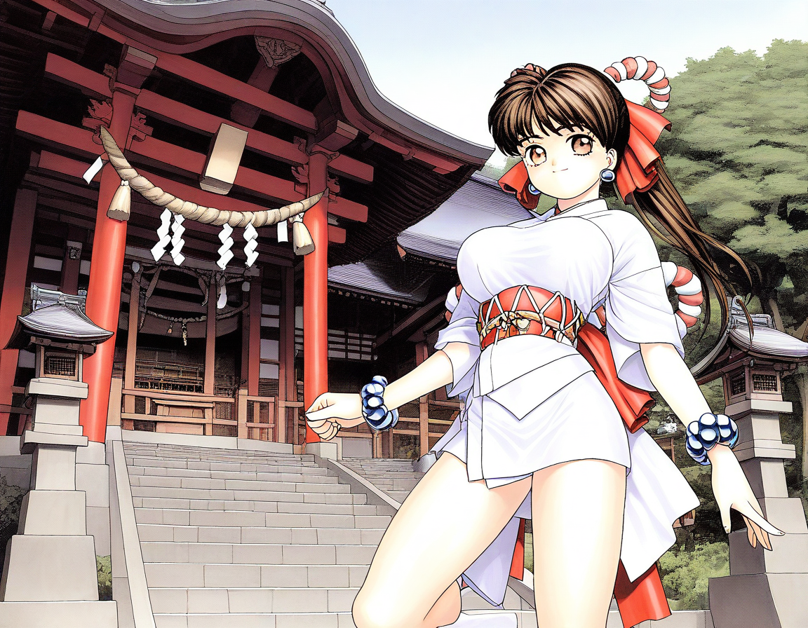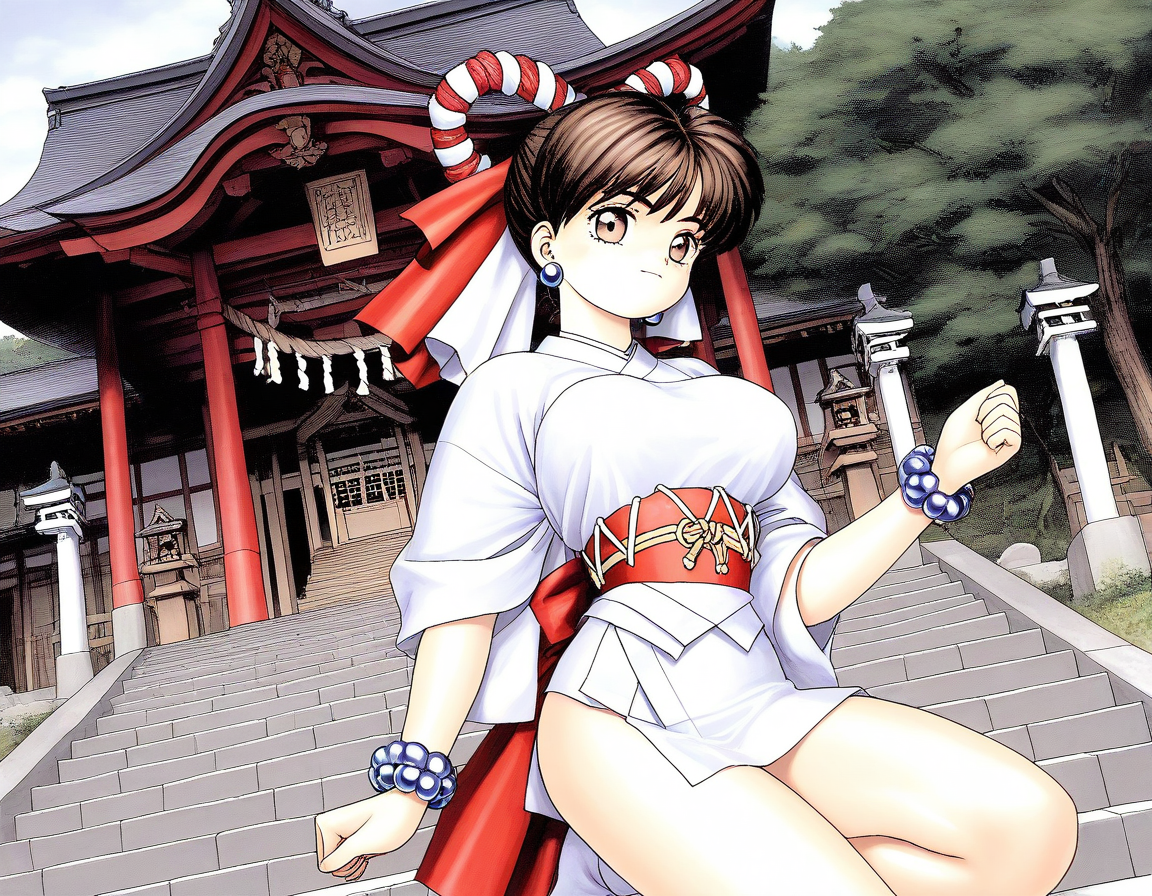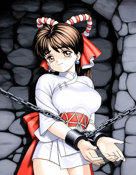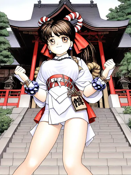 来自 Ponytail Soft 的问答游戏《妖幻道梦》中的真道寺丽梦酱。游戏内容是妖怪封印解除后,通过问答对决来重新封印妖怪。而这位丽梦酱,在游戏本篇中虽然有意外走光的场景,但并无真正的成人情节(那个时代这类角色很常见)。