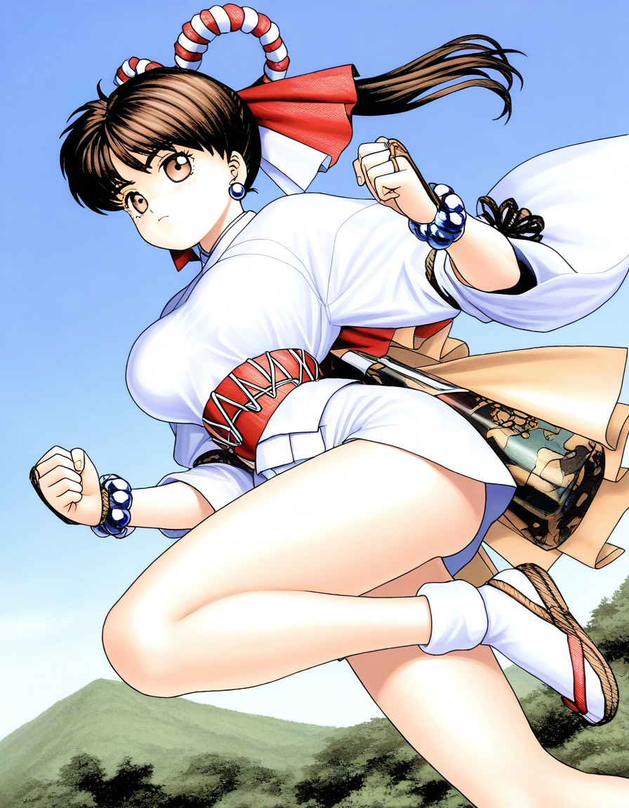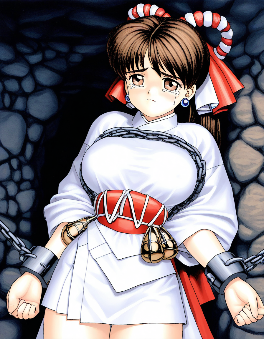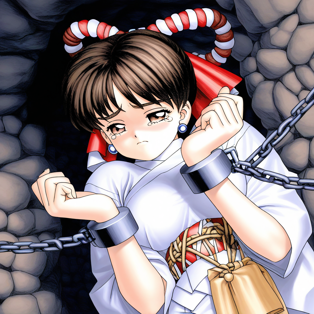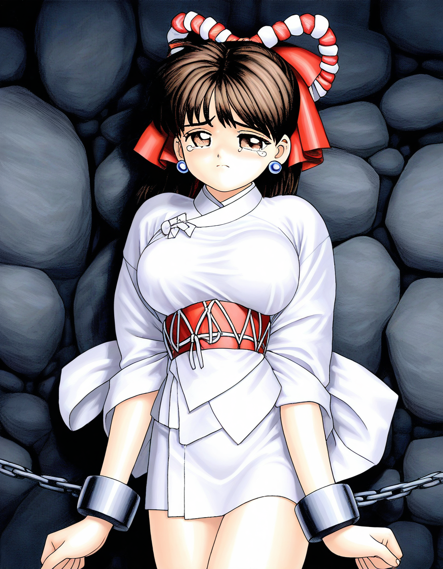 Shindouji_Reimu(Yougen_Doumu), 1girl, solo, 棕发, 棕眼, 大胸, 耳环, 蝴蝶结, 马尾,