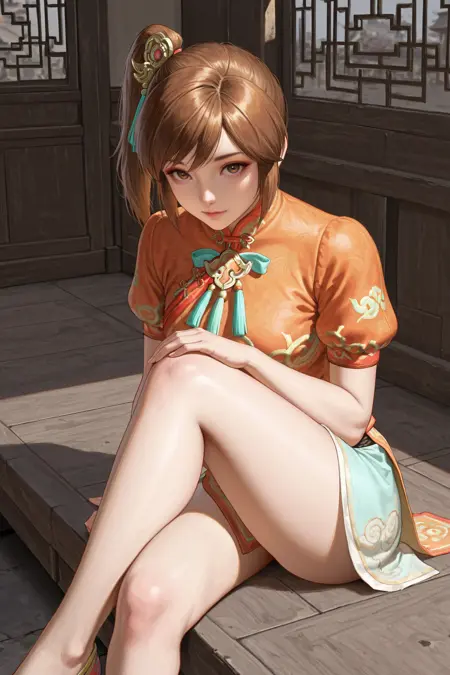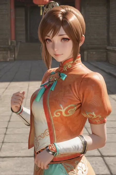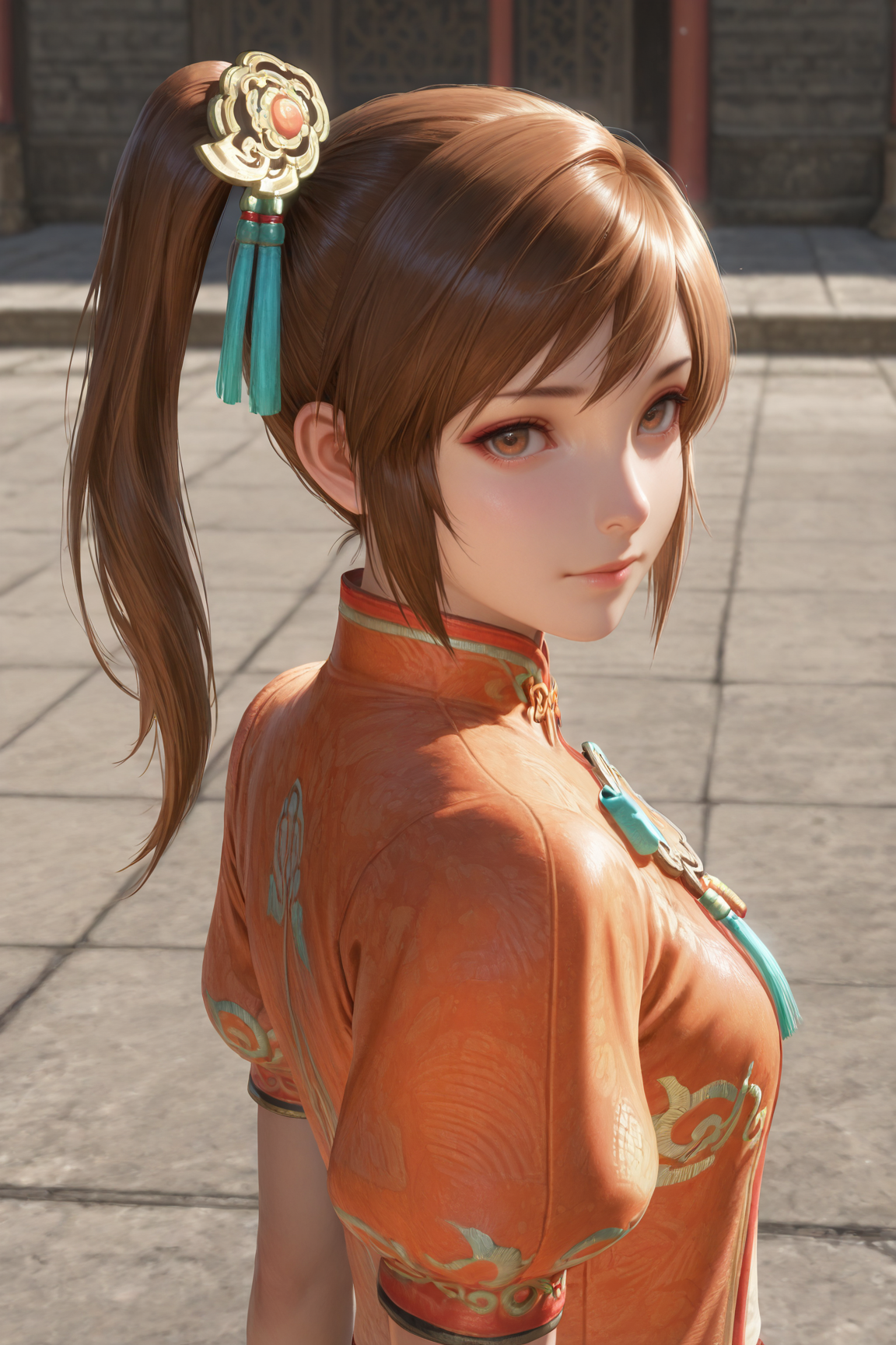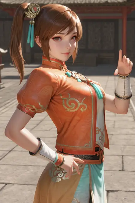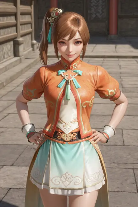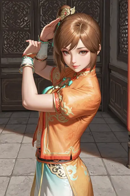 推奨ポジティブプロンプト:xiaoqiao, 1girl, solo, brown hair, brown eyes, side ponytail, chinese clothes, hair ornament, short sleeves, skirt