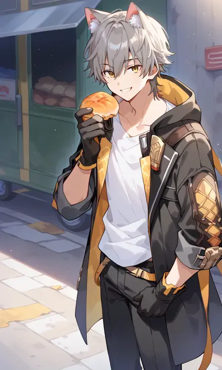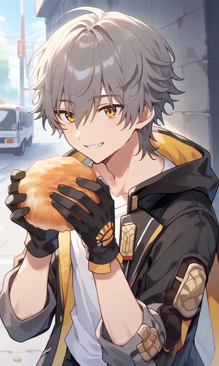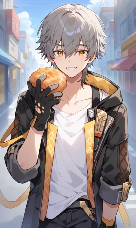 トリガー語: caelus、灰色の髪、短い髪、黄色い目、目の間の髪、シャツ、ジャケット、黒いジャケット、パンツ、