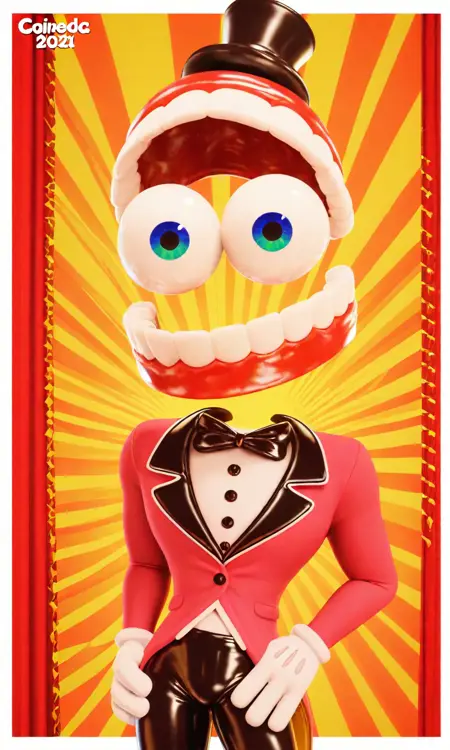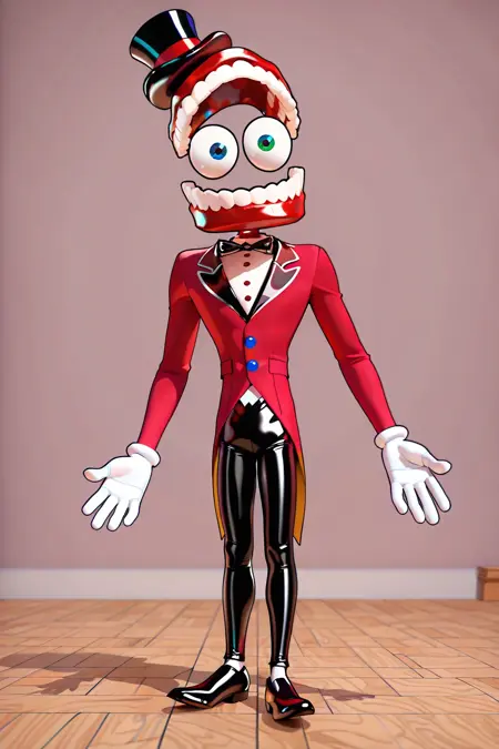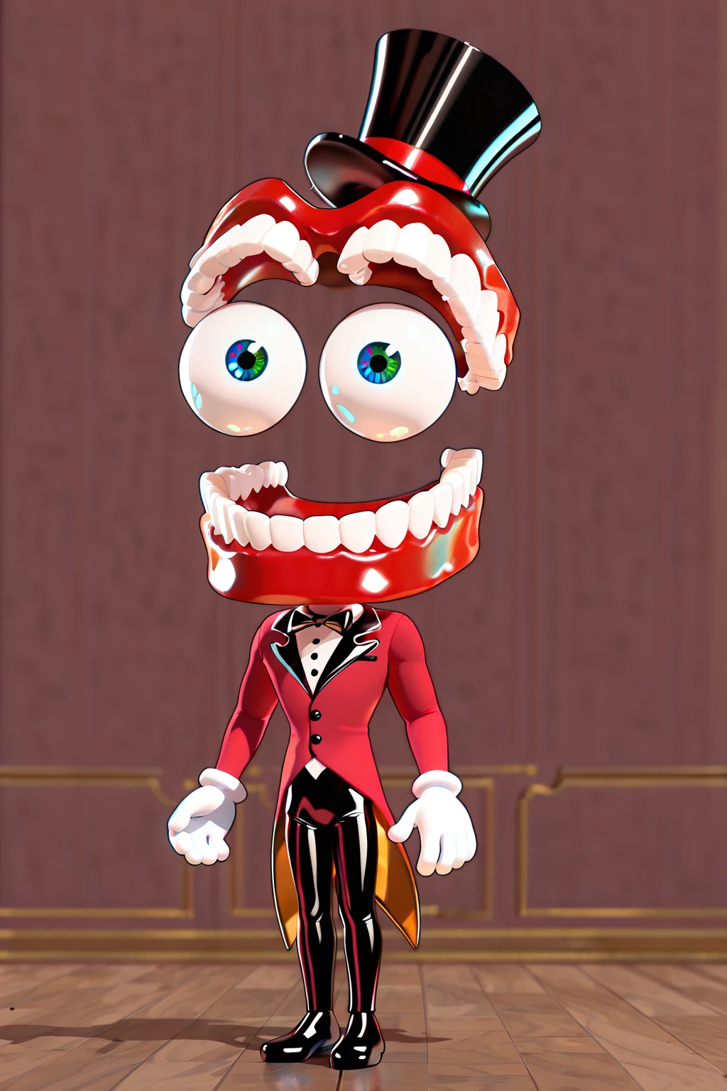 CaineTADC, blue eyes, 1boy, hat, green eyes, teeth, white gloves, black top hat, multicolored eyes, red tuxedo, black bowtie, white undershirt, red buttons, black leggings, denture head, floating shaped head, caine (the amazing digital circus),