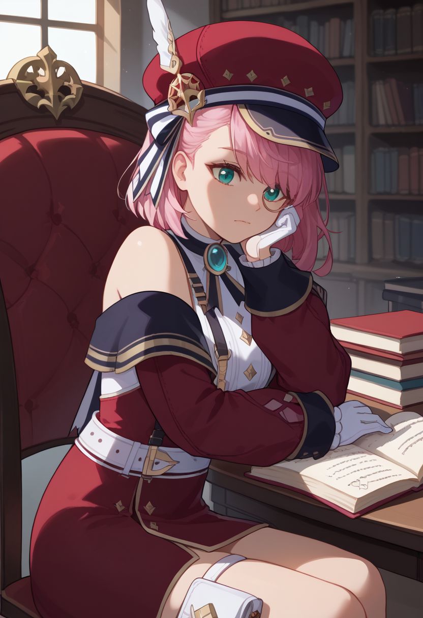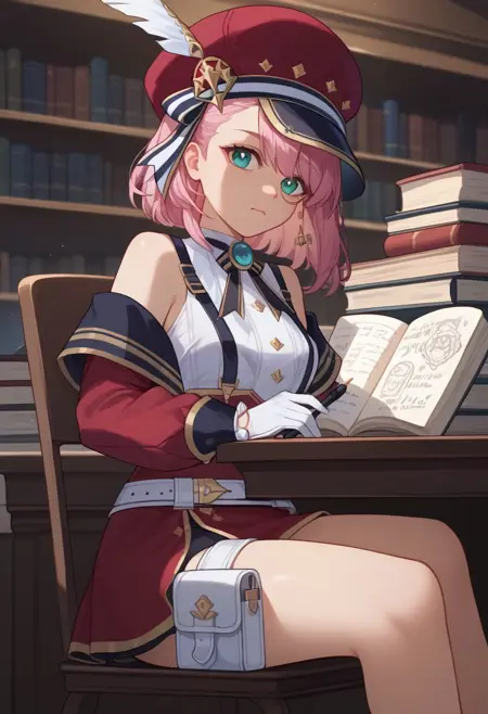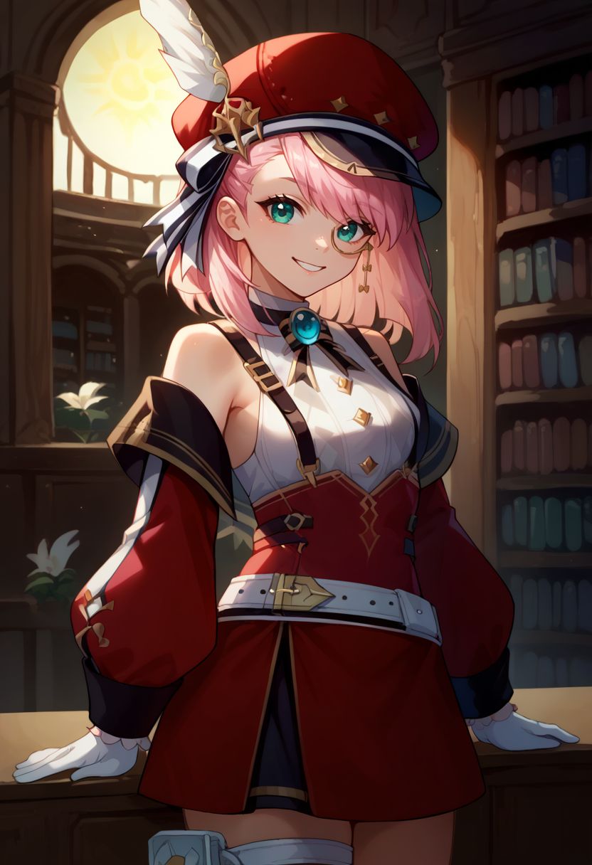 衣装:カーボイハット、赤い頭飾り、ハットの羽、肩出し、白いシャツ、赤いスカート、ジュエリー、青い宝石、リボン、ノースリーブシャツ、赤い袖、白い手袋、宝石、ふんわりした袖、長袖、白いベルト、サスペンダー、太ももストラップ