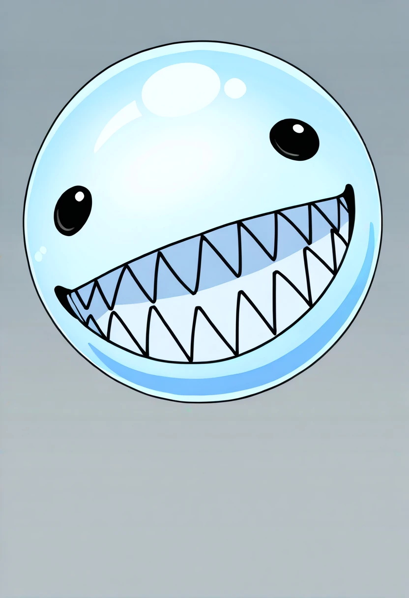 BuubbleTADC, large round bubble, sharp teeth shiny and semi-transparent Body, black dot eyes, no humans