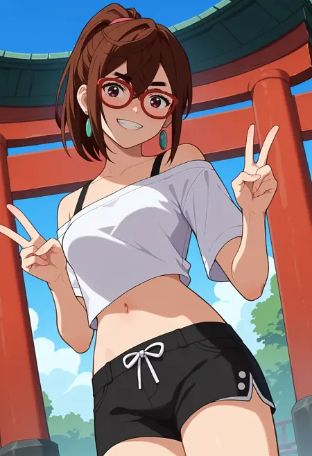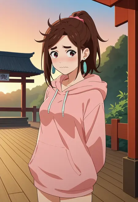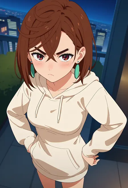 트리거: KJOmomo, 갈색 머리카락, 어두운 눈, 중간 길이 머리카락, 눈 사이의 머리카락, 두꺼운 눈썹, 귀걸이