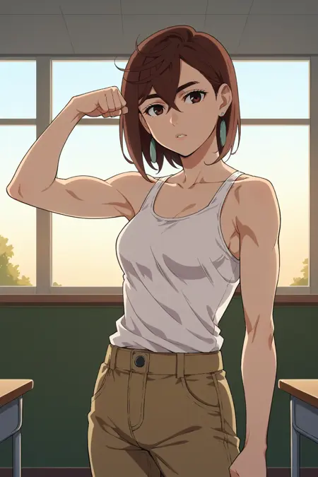 Triggers: KJOmomo, brown hair, dark eyes, medium hair, hair between eyes, thick eyebrows, earrings,