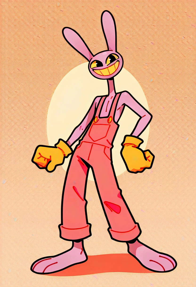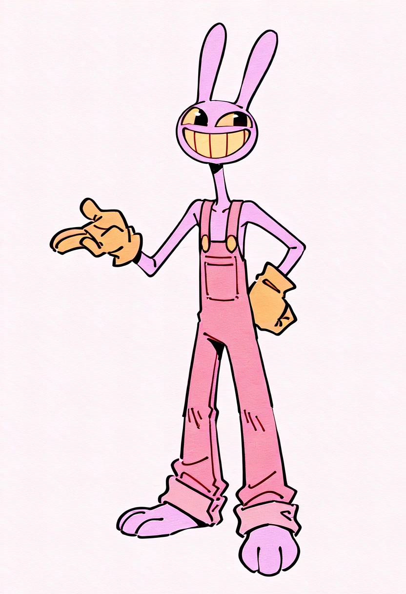 JaxTDAC, 1boy, anthropomorphic lilac cartoon rabbit, long bunny ears, oval-shaped head, tall, long neck, black eyes, yellow sclera, yellow teeth, light pink-colored overalls, pale-yellow gloves, barefoot,
