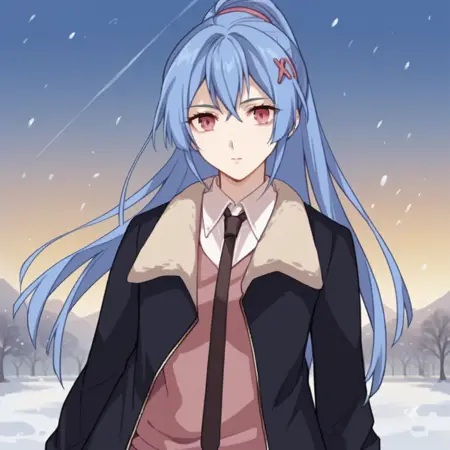 Edi_VN, pink sweater, black jacket, fur-trimmed jacket, collared shirt, long sleeves,blue pants, brown necktie, x hair ornament,