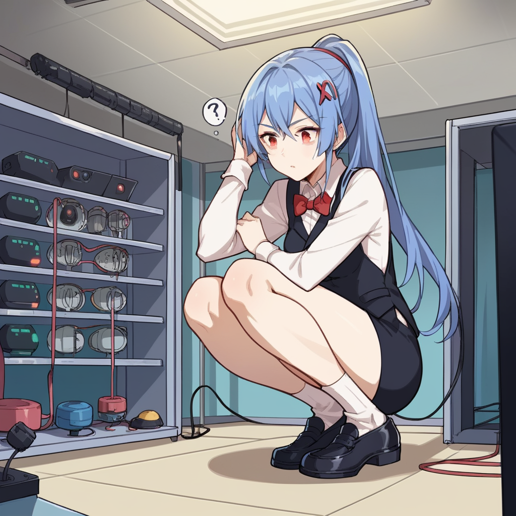 Edi_Stigmata, pencil skirt, black vest, collared shirt, long sleeves, white shirt, red bowtie, x hair ornament, mini skirt,