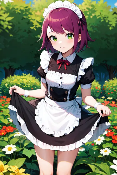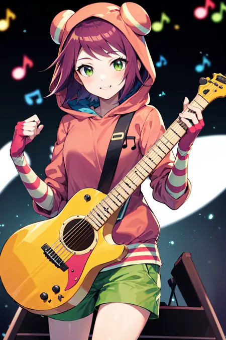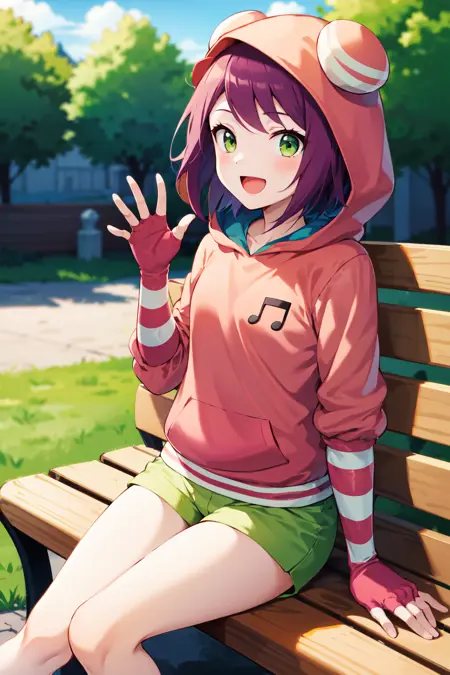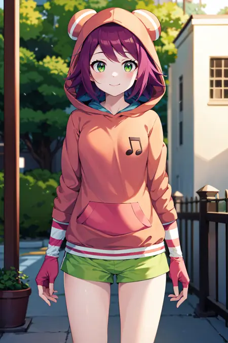아우트핏11girl, solo, short hair, purple hair, green eyes, hood up, pink hoodie, musical note, elbow gloves, striped gloves, fingerless gloves, green shorts