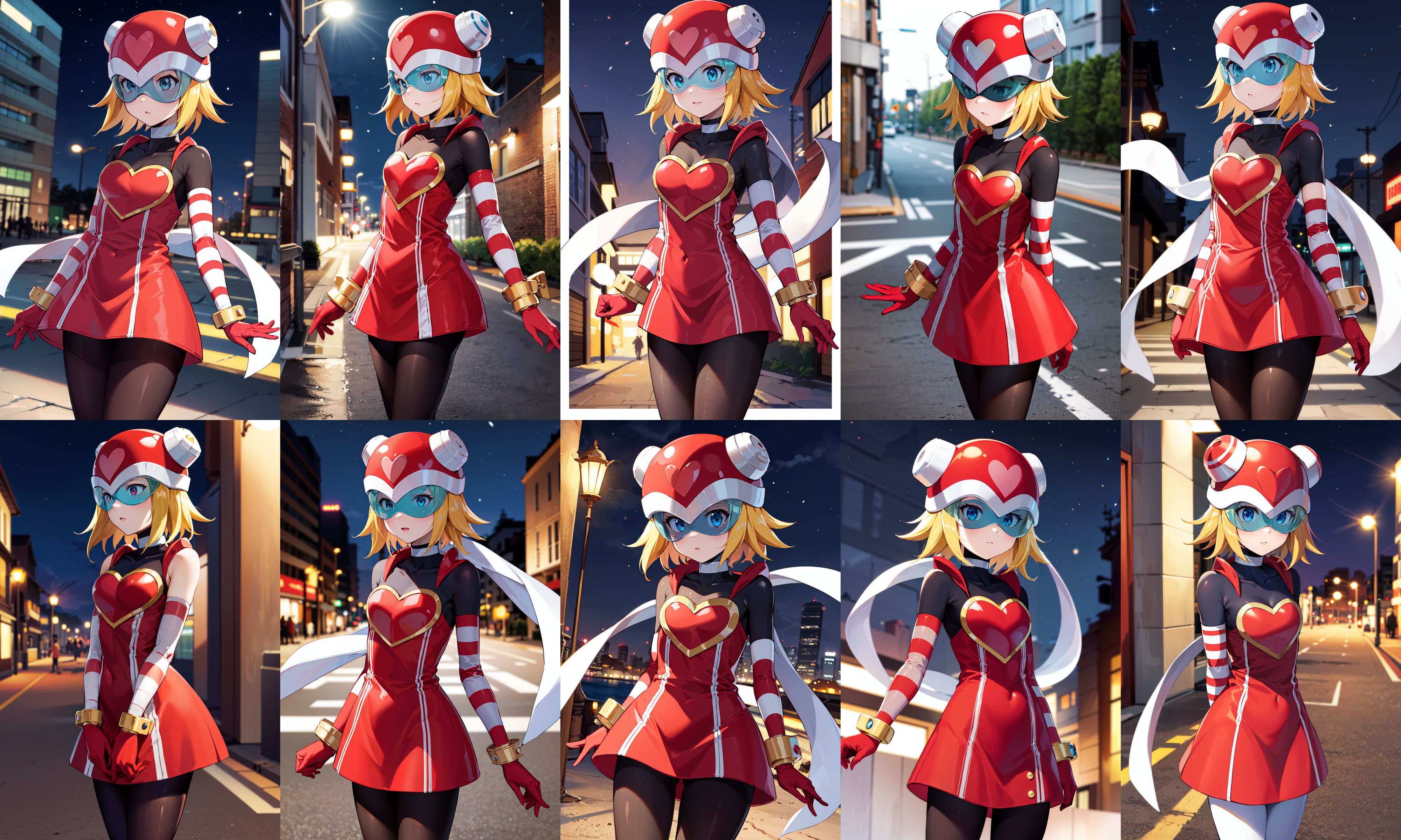아우트핏21girl, solo, short hair, blonde hair, helmet, goggles, tinted eyewear, white choker, white scarf, bodysuit, red dress, heart, long sleeves, striped, bracelet, red gloves