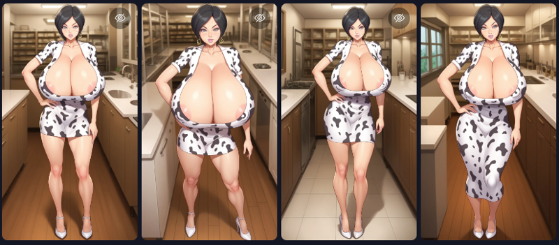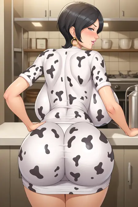 ➜ MMegamoundsMFGXL、熟女、ピンクの唇、顔のほくろ、灰色の目、黒髪、ショートヘア、分け目のある前髪、黄色いイヤリング、巨大な胸、鎖骨、胸元、乳輪のずれ、牛柄、白いドレス、短い袖、短い丈、白いハイヒール、靴