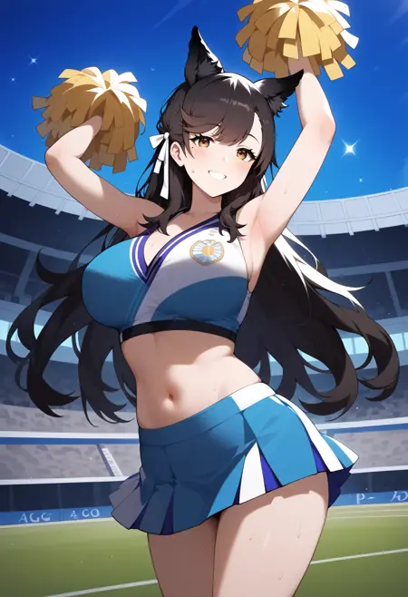outfit1aaatago, long hair, black hair, hair ribbon, animal ears, brown eyes, mole under eye, large breasts, military uniform, aiguillette, white jacket, long sleeves, white gloves, white skirt, side slit, garter straps, black thighhighs