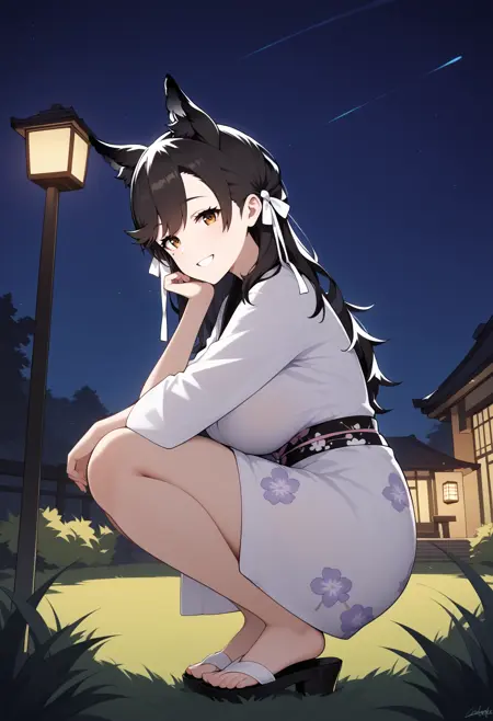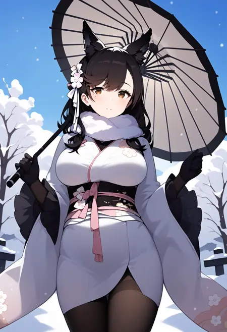 outfit3aaatago, long hair, black hair, hair ornament, hair ribbon, animal ears, brown eyes, mole under eye, large breasts, fur scarf, japanese clothes, wide sleeves, frilled sleeves, black gloves, sash, obi, white kimono, black pantyhose