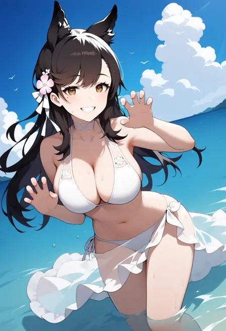 outfit2aaatago, long hair, black hair, hair flower, animal ears, brown eyes, mole under eye, large breasts, white choker, cleavage, white bikini, sarong