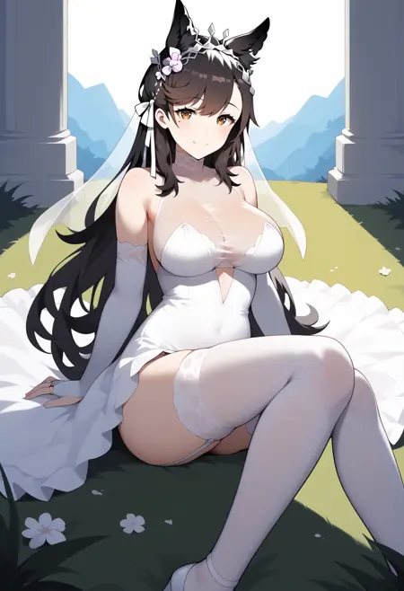 outfit5aaatago, long hair, black hair, veil, tiara, hair ribbon, animal ears, brown eyes, mole under eye, large breasts, bare shoulders, see-through, wedding dress, white dress, bridal gauntlets, elbow gloves, white gloves, white thighhighs, garter straps