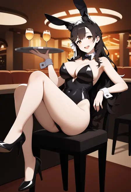 outfit6aaatago, long hair, black hair, hair ribbon, animal ears, brown eyes, mole under eye, large breasts, cleavage, shrug (clothing), white shirt, highleg bikini, black bikini, sleeve cuffs, wrist cuffs, black thighhighs