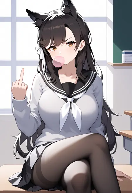 outfit4aaatago, long hair, black hair, hair ribbon, animal ears, brown eyes, mole under eye, large breasts, collarbone, school uniform, black sailor collar, white neckerchief, grey sweater, long sleeves, pleated skirt, black skirt, black pantyhose