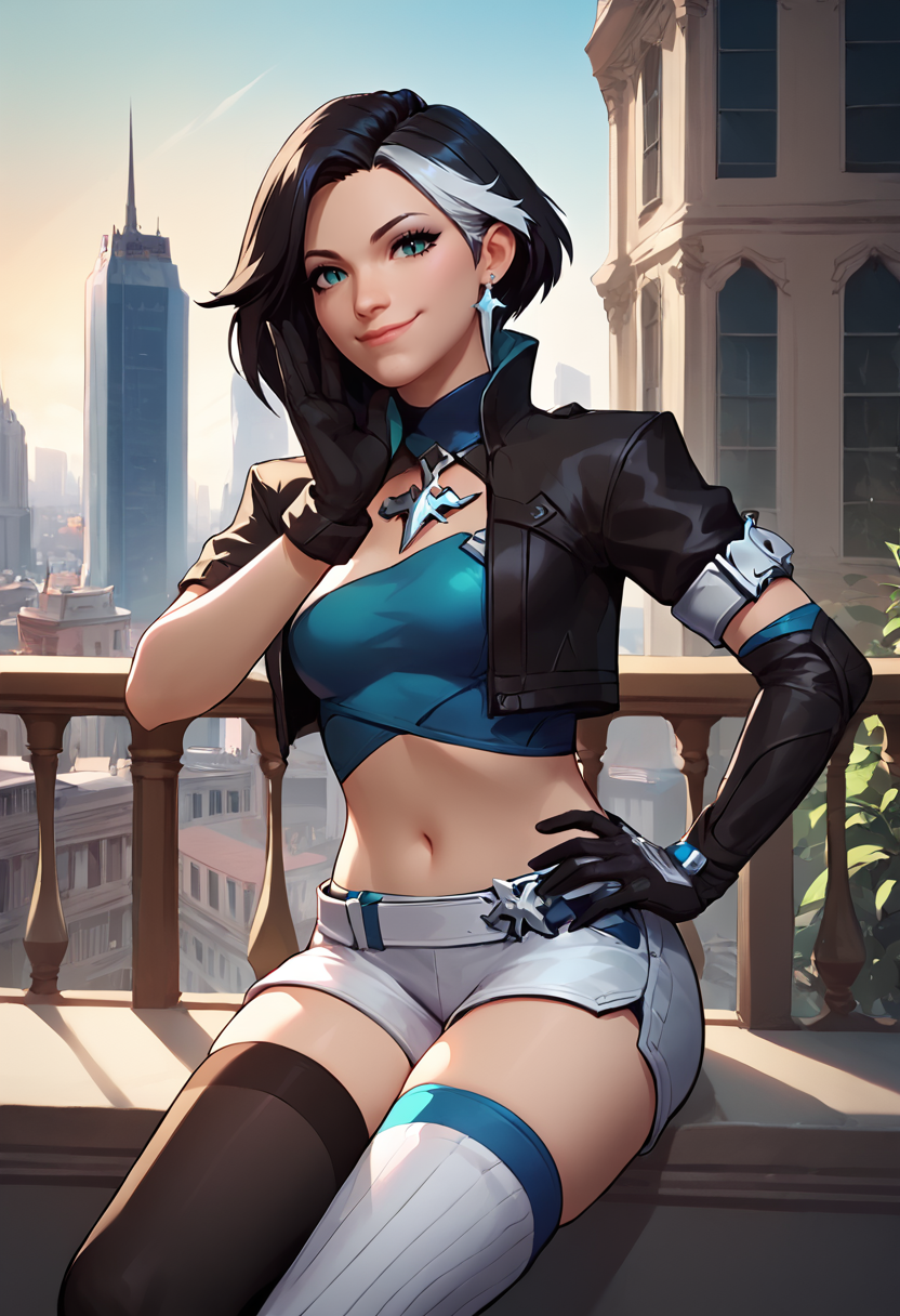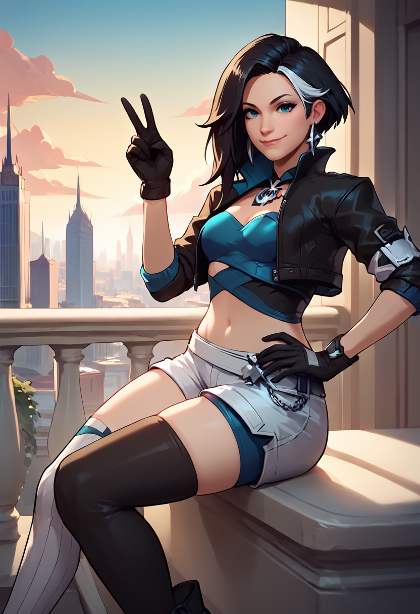 Principal tags: black hair, two-tone hair, cropped jacket, midriff, white shorts, thighhighs, gloves, asymmetrical legwear