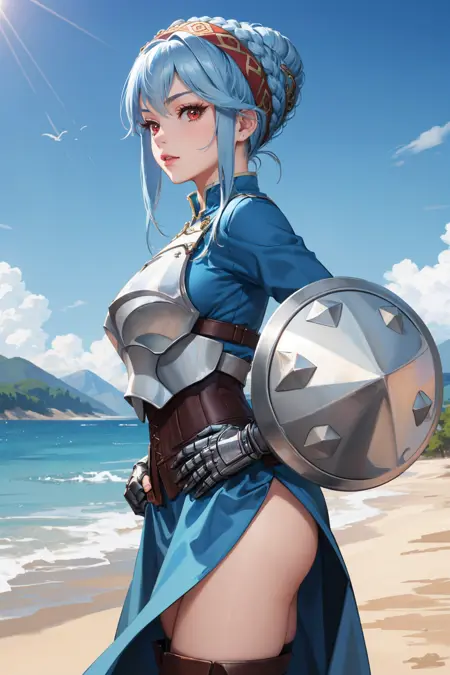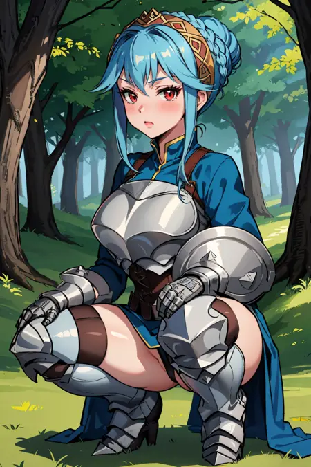그녀의 전형적인 외모를 위해 "헤어밴드, 파란 드레스, 긴 소매, 갑옷, 코르셋, 골반 커튼, 장갑, 갑옷 부츠"를 추가하세요.