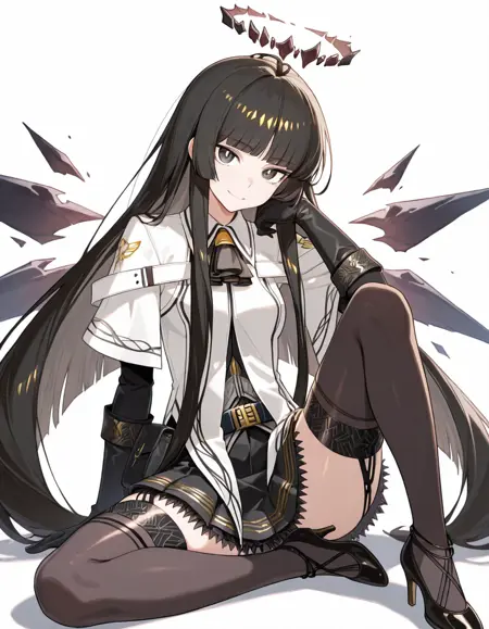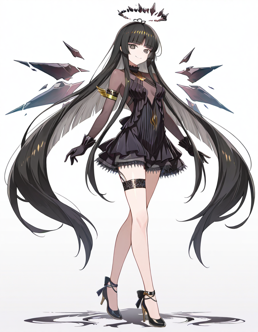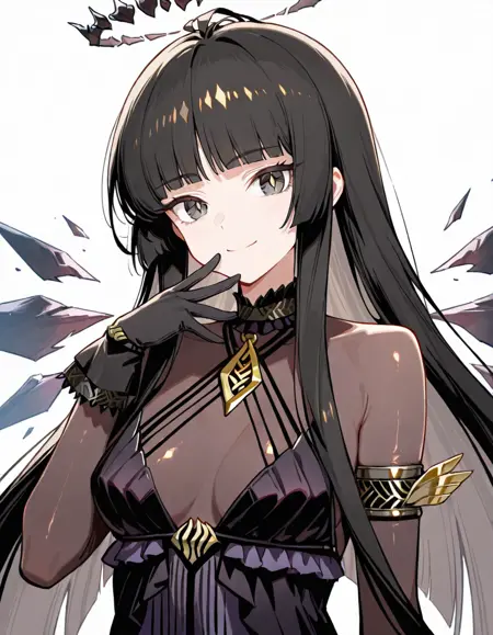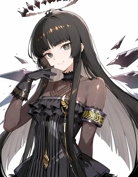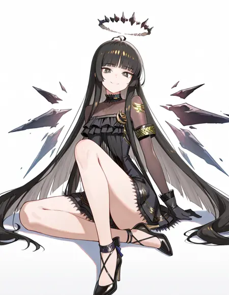 Virtuosa, vrt_broken_halo, vrt_detached_wings, long hair, black hair, blunt bangs, black eyes, diamond shaped pupils