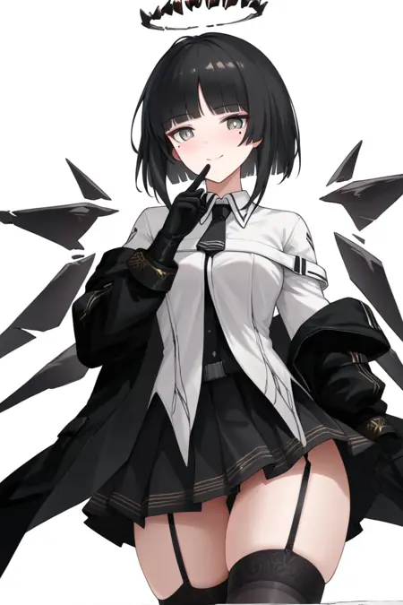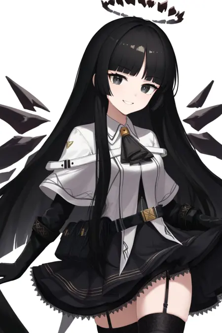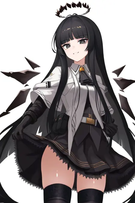Virtuosa, vrt_broken_halo, vrt_detached_wings, long hair, black hair, blunt bangs, black eyes, diamond shaped pupils