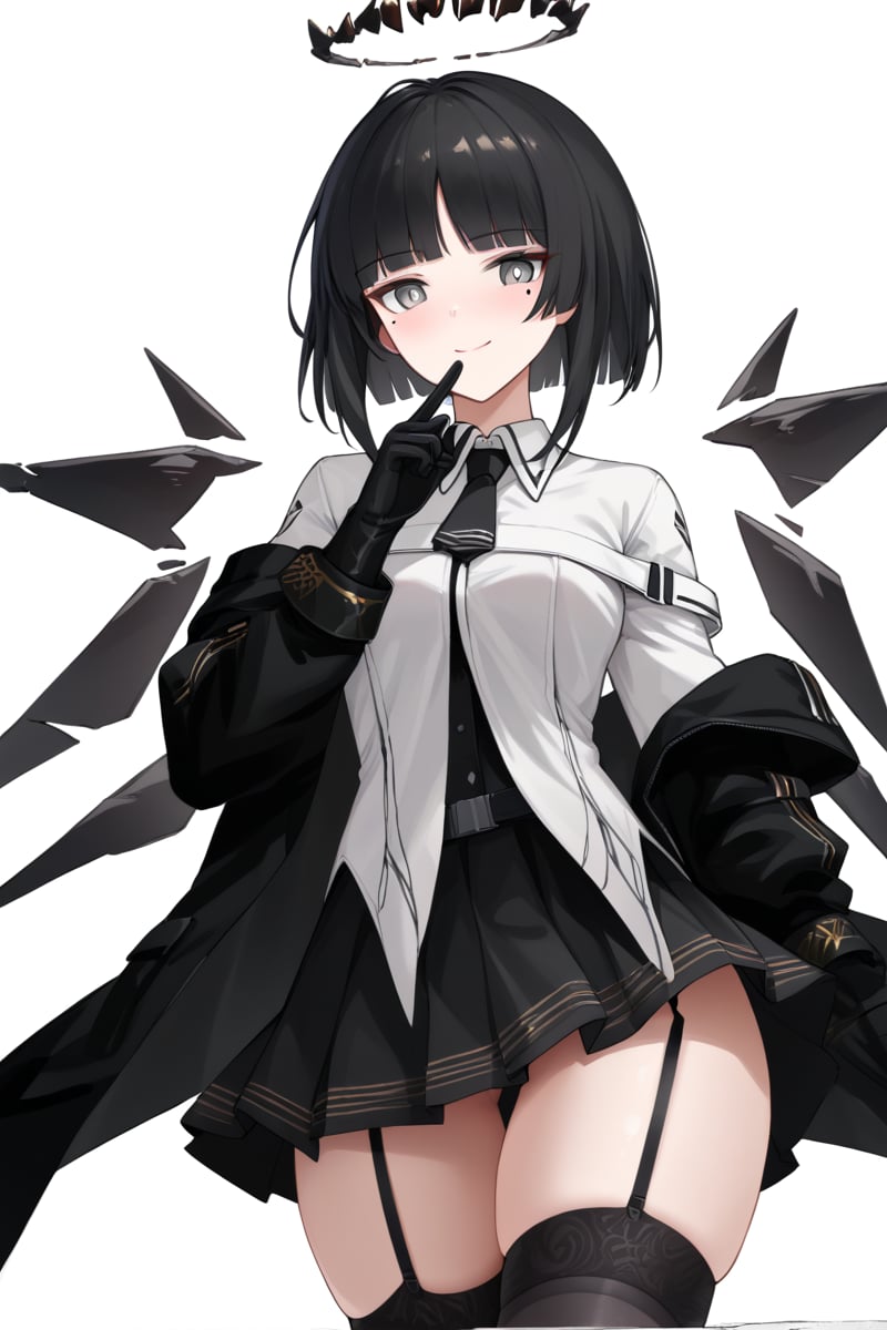 black belt, lace-trimmed legwear, lace-trimmed skirt, vrt_skirt, vrt_gloves, vrt_shirt, vrt_wings, vrt_ascot, vrt_halo, vrt_thighhighs, vrt_capelet