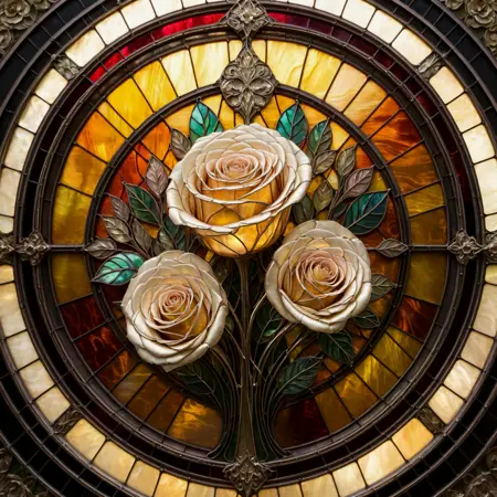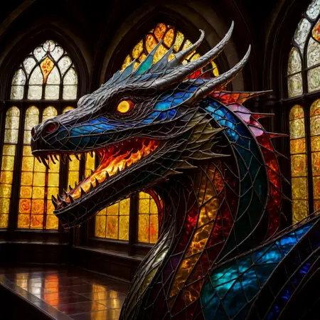 스테인드 글라스 및 금속 LoRA는 황동과 스테인드 글라스가 포함된 이미지로 학습되어, 색색의 요소와 금속적인 하이라이트가 특징인 특정 스타일을 생성합니다. 가중치를 낮추면 사람, 얼굴, 생물 등 다른 요소들이 더 쉽게 나타납니다.
