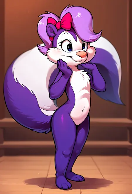 プロンプト:fifi、スカンク、anthro、ヘアボウ、紫色の体、尾を掴む、セーター