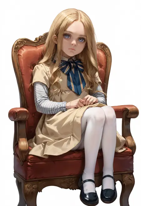 score_9, score_8_up, score_7_up, score_6_up, score_5_up, score_4_up, source_anime, BREAK, 1girl, solo, expressionless, sitting, chair, looking at viewer, simple background, <lora:M3GAN_V1:1> m3gandoll, realistic, doll, long hair, blue eyes, blonde hair, forehead, dress, striped sleeves, big bowtie, multicolored bowtie, white pantyhose, pantyhose, shoes, mary janes,