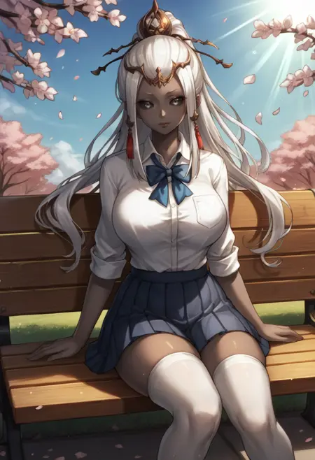 복장: ["sophiaffxiv, very dark skin, headpiece, grey sclera, grey eyes, white hair, long hair, ponytail, colored skin, revealing clothes, midriff, armlet, underboob, crown, hagoromo, shawl"]