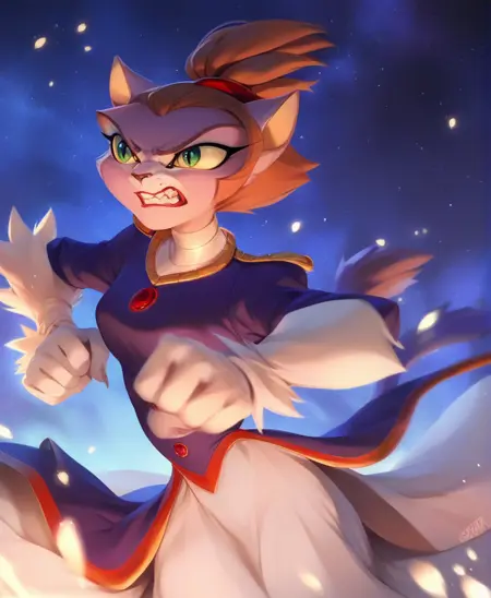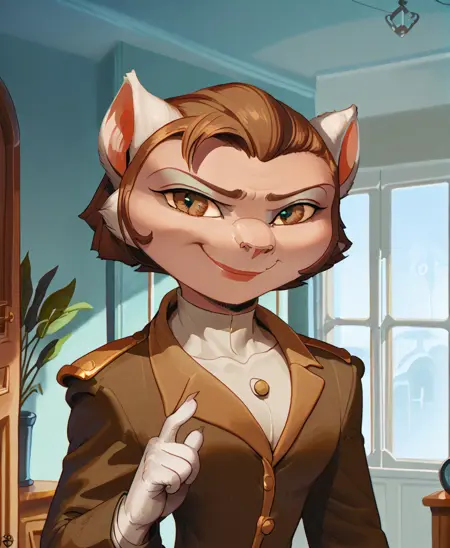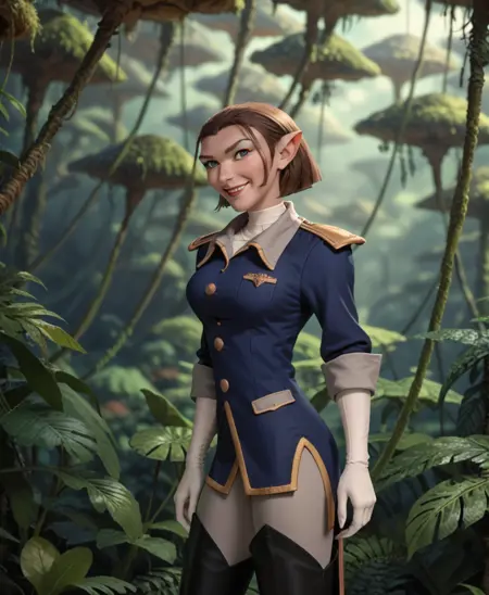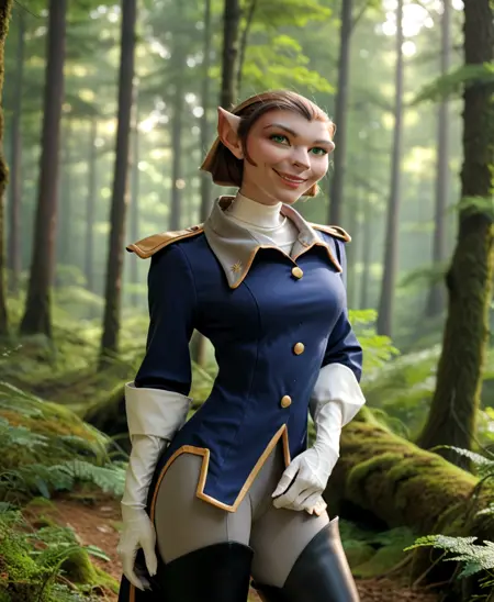 在本版本中,我完全移除了 猫形人类 和 外星人 标签。现在真正重要的标签只有 制服、绿色眼睛 和 女性。此外还有一些关于她靴子的标签。仅使用 过膝靴 通常适用于从大腿以上部分的图像;若要展现她站立的全身照,请使用完整的 高跟过膝靴。当然,你也可以根据需要使用其他物种或服装标签。