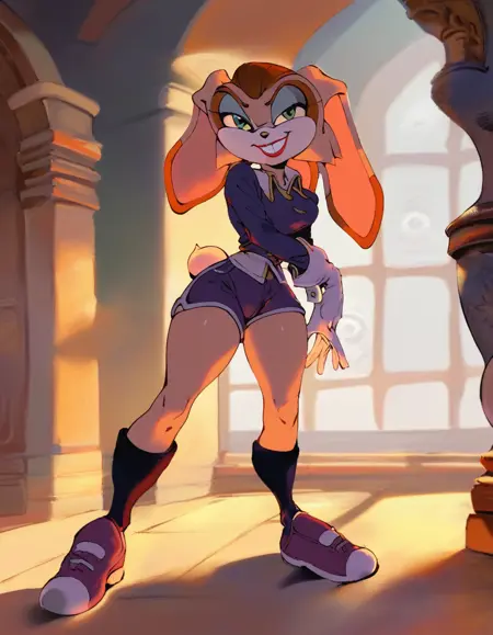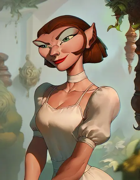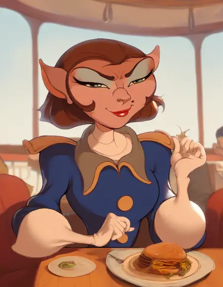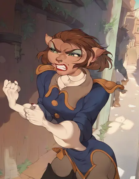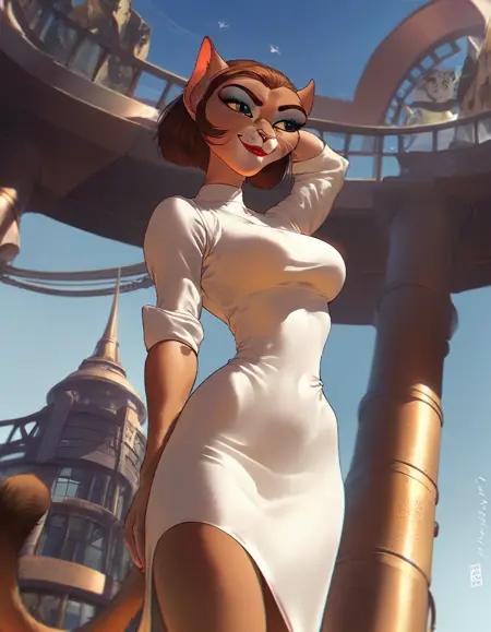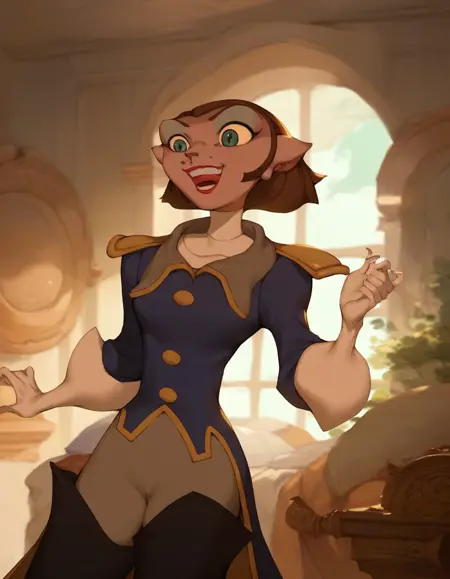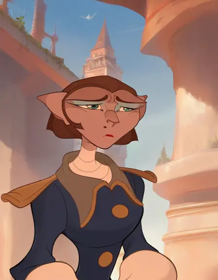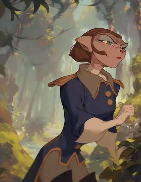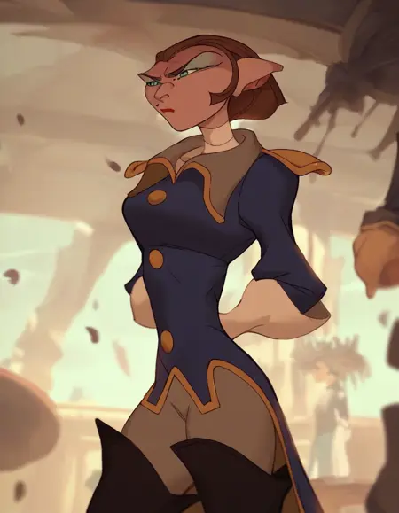在本版本中,我完全移除了 猫形人类 和 外星人 标签。现在真正重要的标签只有 制服、绿色眼睛 和 女性。此外还有一些关于她靴子的标签。仅使用 过膝靴 通常适用于从大腿以上部分的图像;若要展现她站立的全身照,请使用完整的 高跟过膝靴。当然,你也可以根据需要使用其他物种或服装标签。