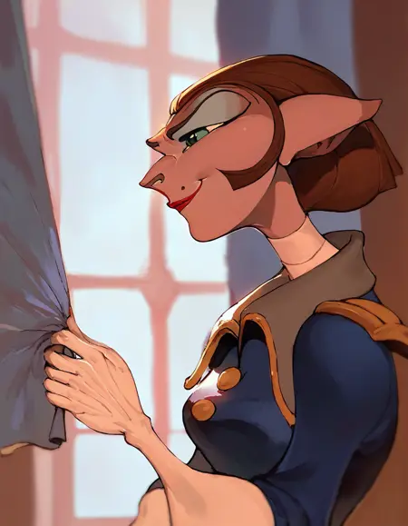 I got rid of the feline humanoid, and alien tags completely in this version. Now the only real important tags are uniform, green eyes, and female. There's also a couple tags for her boots. Putting in just thigh boots works mostly for images from the thigh up. use the full high heeled thigh boots for a more full shot of her standing. Of course you can use other species and clothing tags if you want.