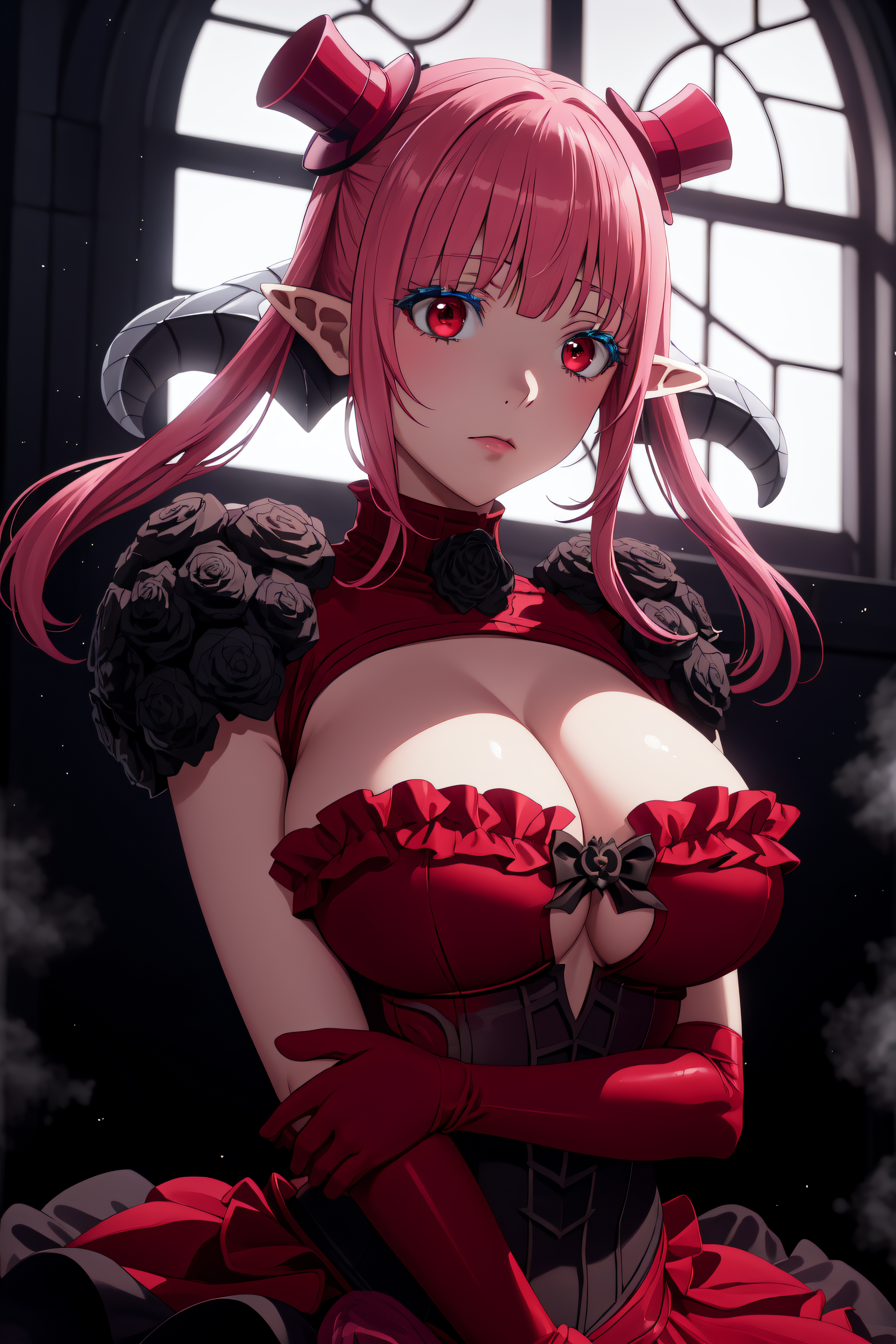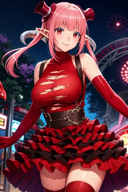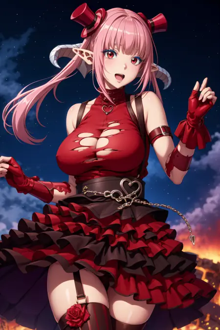 主服装 - 荷叶边裙子, 黑玫瑰, 肩垫, 红色护肘手套, 条纹过膝袜, 小礼帽