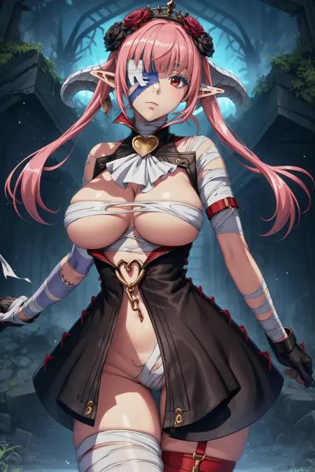 僵尸服装(来自手游) - 黑色大衣, 领结, 缝线, 拼接皮肤, 发饰花, 裸露绷带, 缠头绷带, 不对称裤装, 单条过膝袜, 光裸肩膀