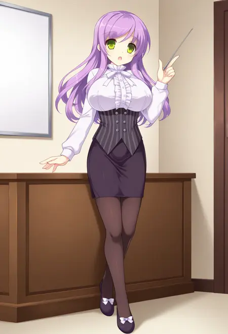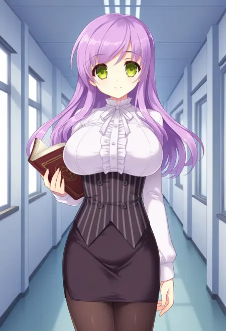 캐주얼 - kirierikudoublades, 보라색 머리카락, 긴 머리카락, 녹색 눈, 큰 가슴, 셔츠, 긴 소매, 중앙 프릴, 목 리본, 피스트립 언더버스트, 연필 스커트, 팬티스타킹, 플랫슈즈, 신발 리본