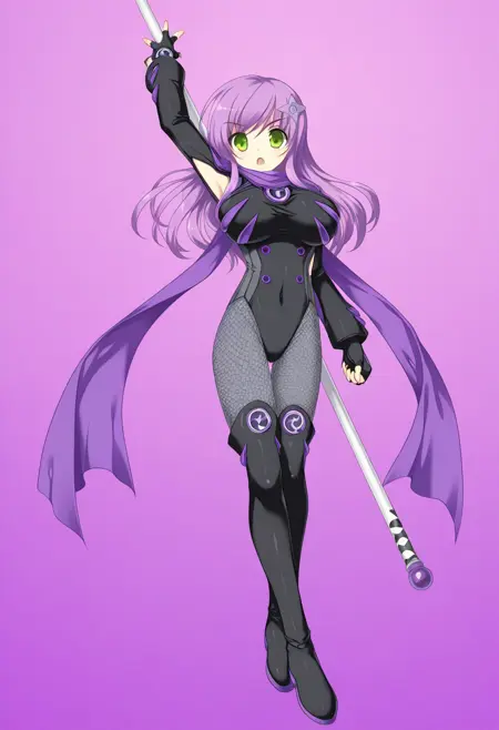 Shadow Gear - kirierikudoublades, shadowgearoutfit, 보라색 머리카락, 긴 머리카락, 녹색 눈, 큰 가슴, 머리 장식, 긴 스카프, 레오타드, 긴 소매, 겨드랑이 절개, 피시넷, 손가락 없는 장갑, 피시넷 팬티스타킹, 허벅지 부츠