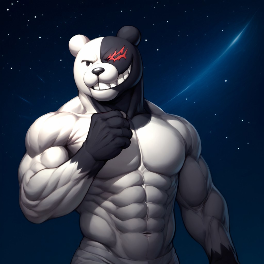 Options: standing, sitting, blush, sweat, hand up, open mouth, holding, anger vein, red eyes, arms up, muscular, necktie